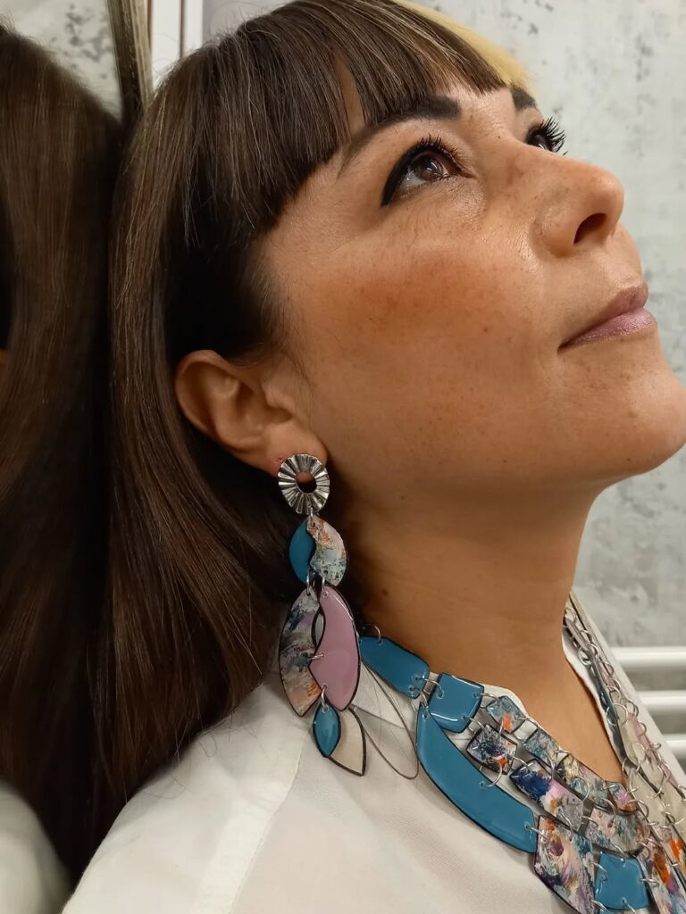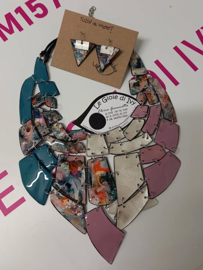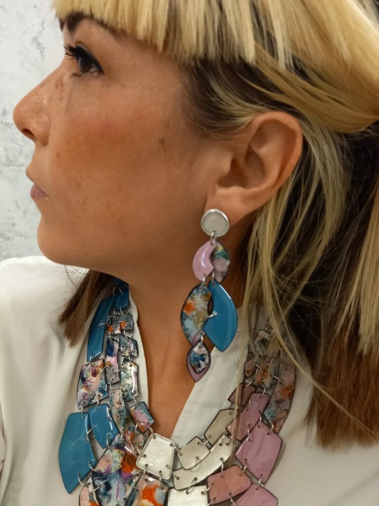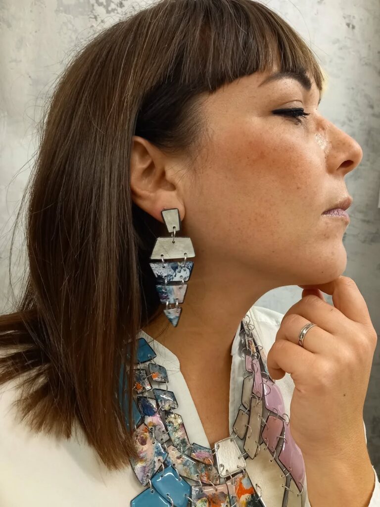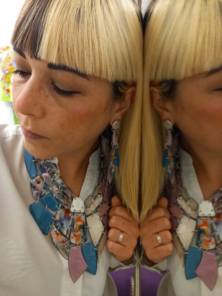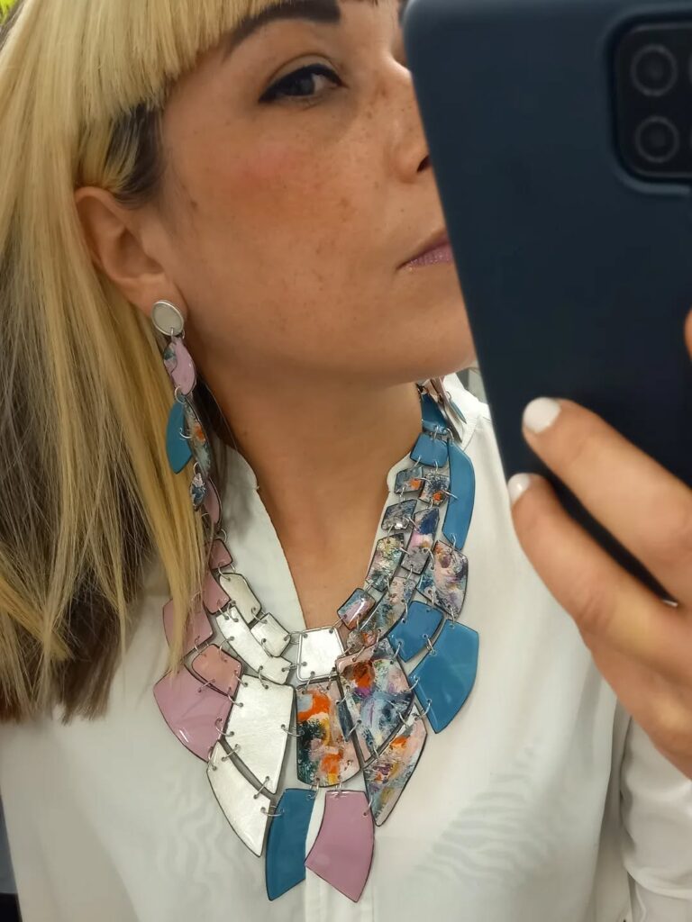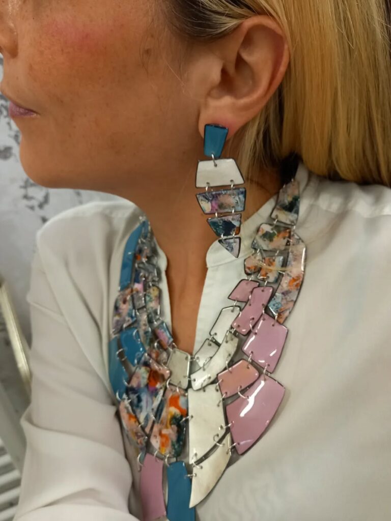 La collana, con le sue forme irregolari e i colori vibranti, ricorda un’ armatura moderna: potente, artistica, femminile.